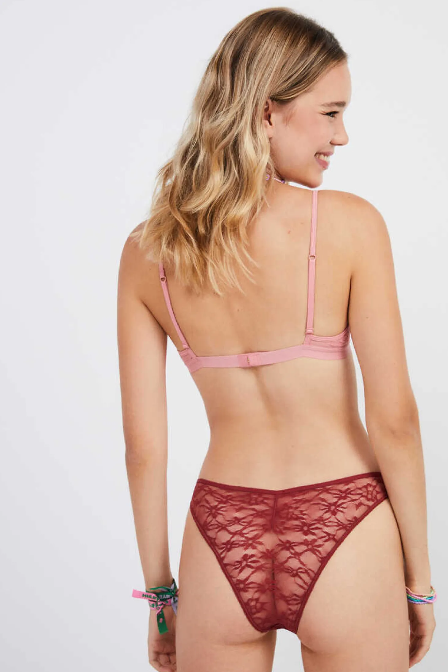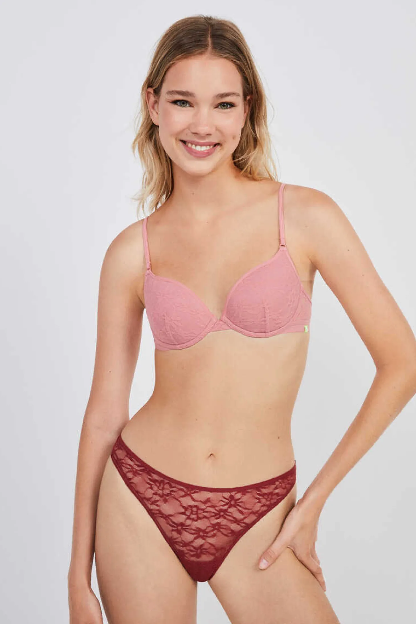 Soutien Com Enchimento E Aro, Confecionado Com Uma Delicada Renda De Cor Rosa. Ideal Para Usar Com Os Teus Looks Mais Arranjados.