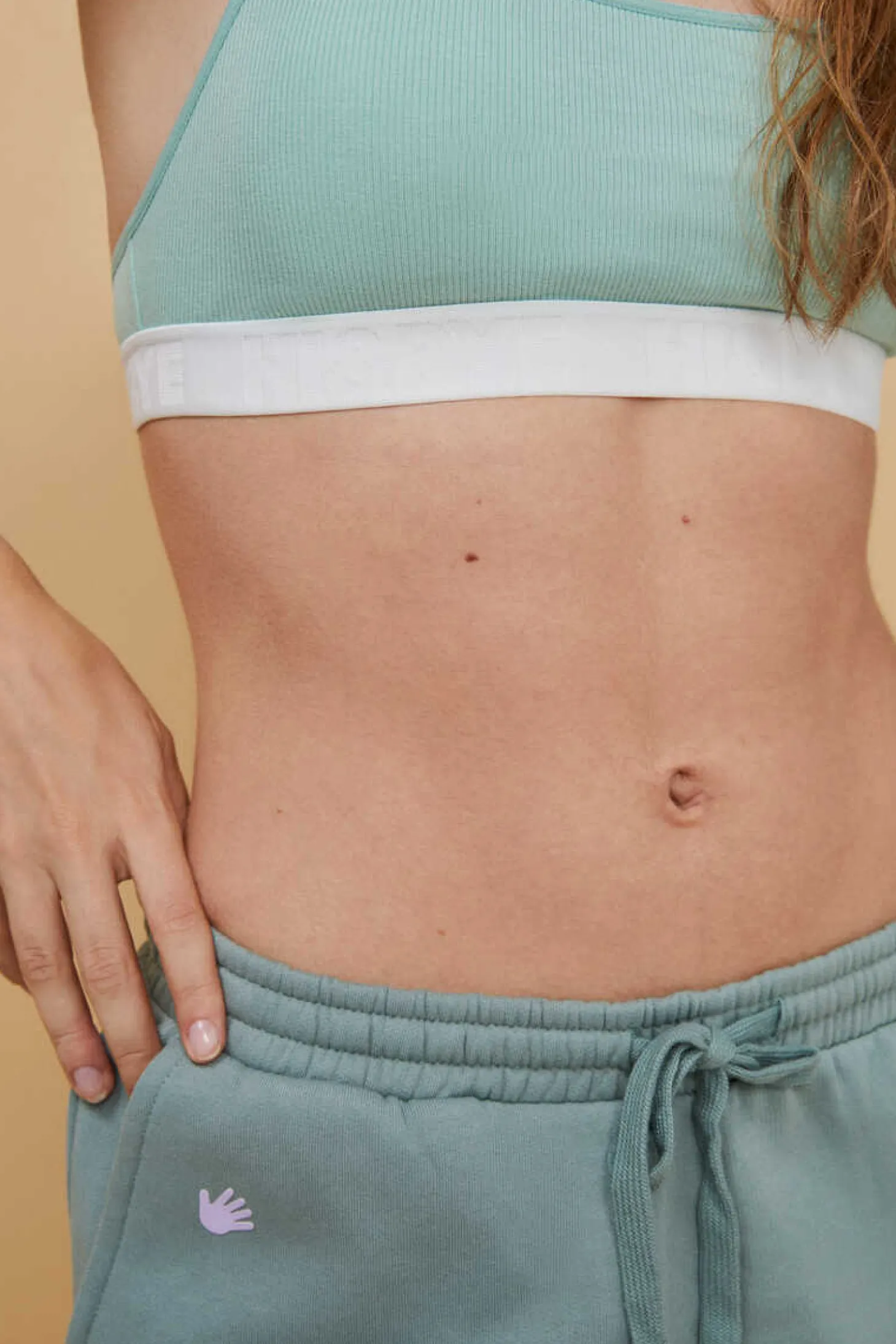 Soutien De Algodao Tipo Top, Com Comodas Copas De Por E Tirar. De Cor Verde, Confecionado Em Tecido Rib (Canelado) E Detalhe De Elastico Sob O Peito.