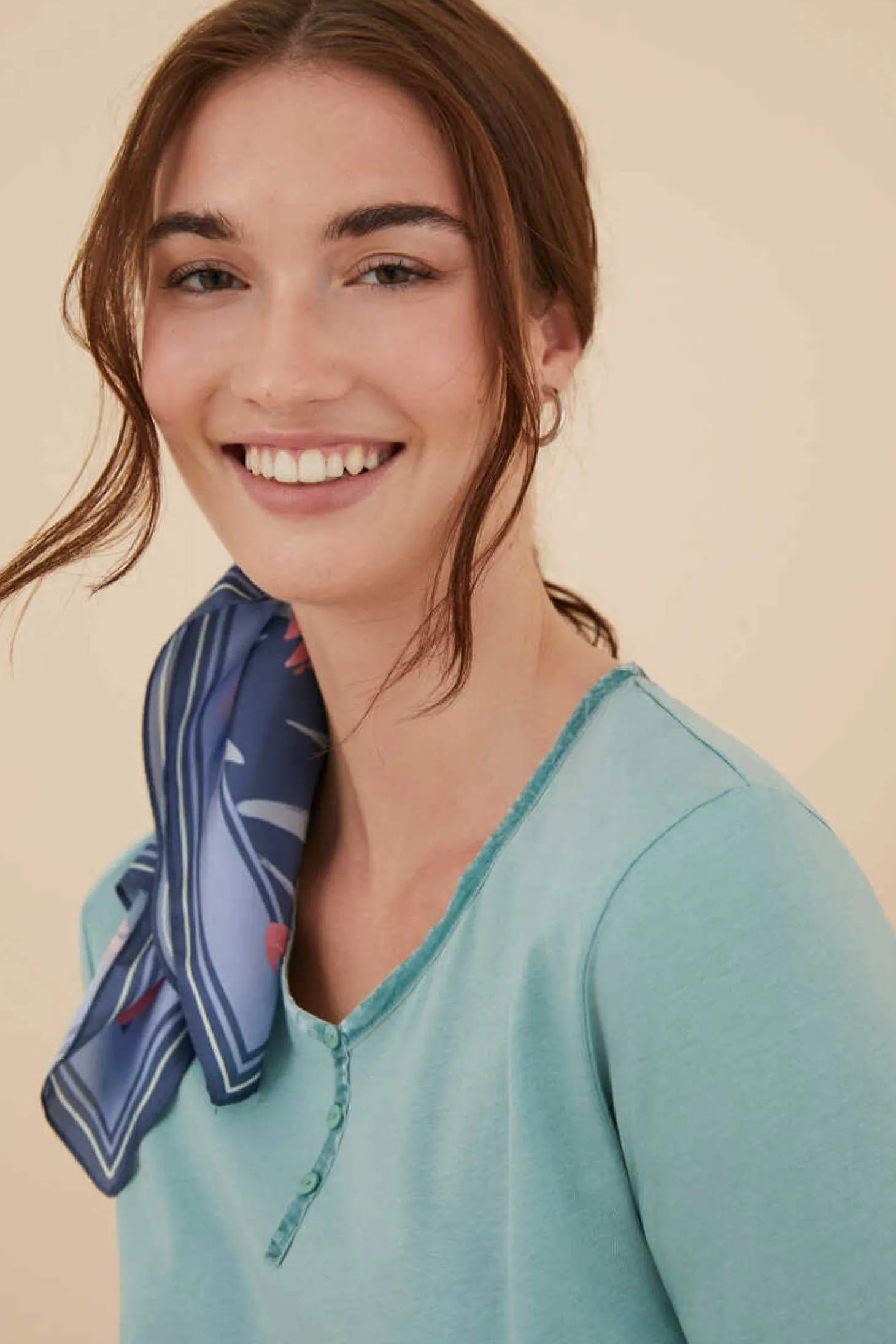 T-Shirt 100% Algodao De Manga Comprida, Em Verde, Com Decote Em Bico, Detalhe De Carcela Em Veludo No Tom E Botoes De Nacar. Ombro Caido E Estampado Na Parte In … Terior Das Costas. Combina Com Varias Calcas Diferentes, Escolhe O Teu Favorito E Personaliza O Teu Proprio Pijama.