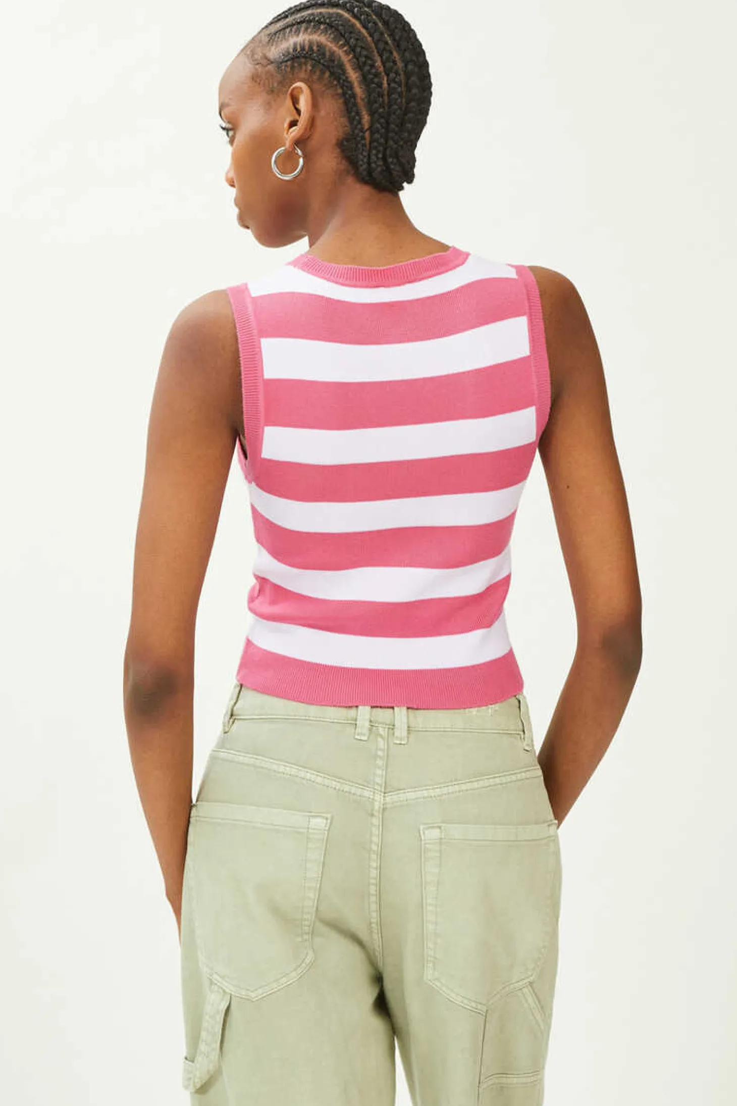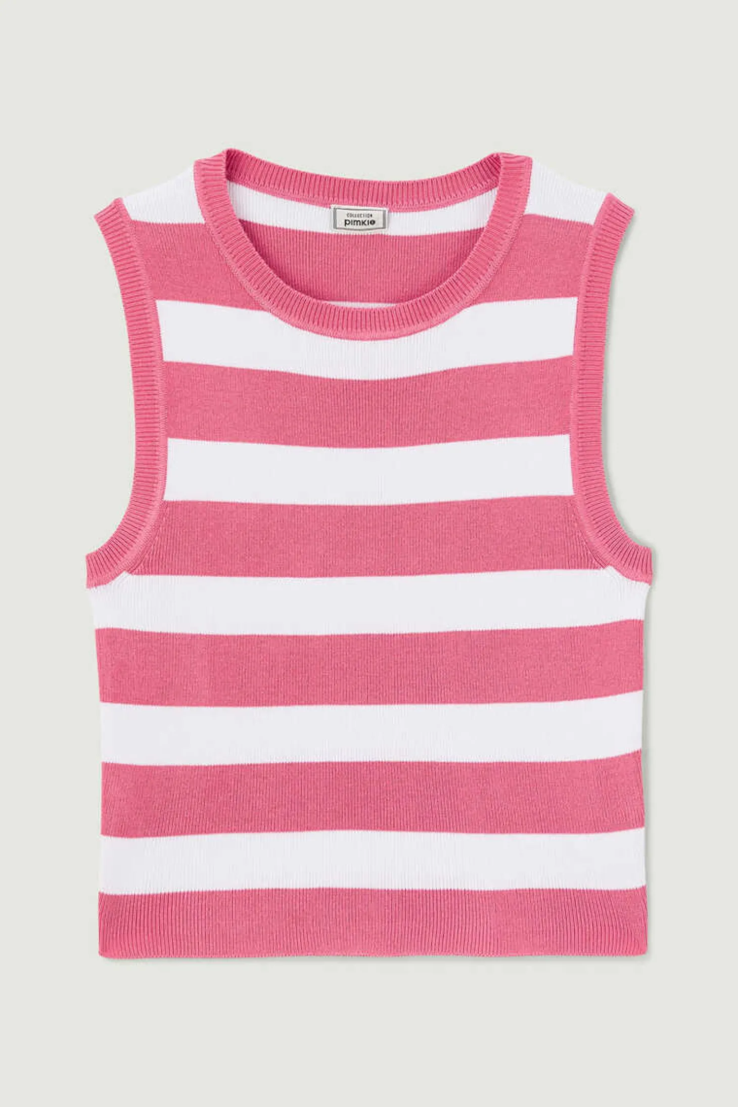 – T-Shirt De Alcas Curta As Riscas Rosa E Branca De Malha Fina.