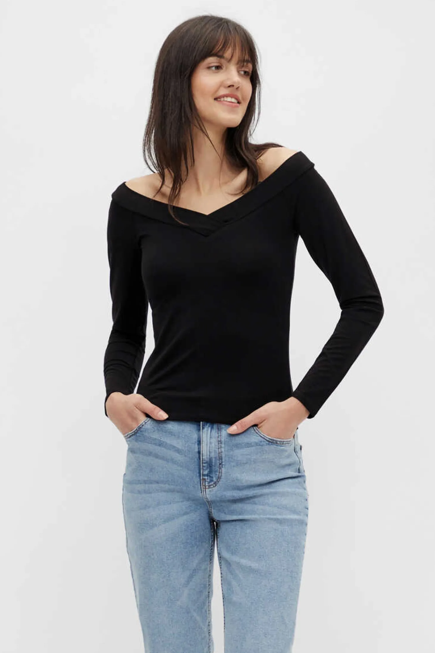 T-Shirt De Malha E Manga Comprida. Gola Em Forma De V.