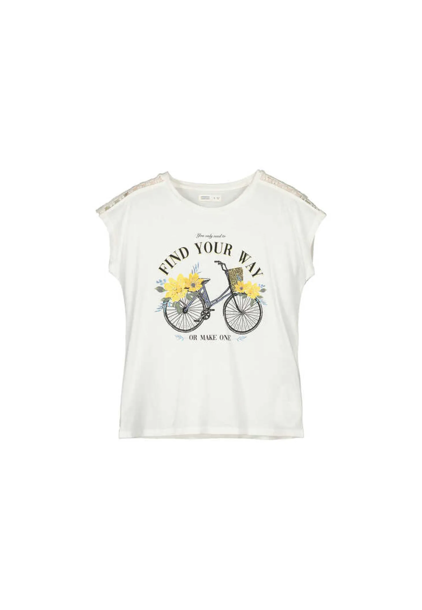 T-Shirt De Manga Curta Descaida, Com Gola Redonda, Detalhe De Laco Nos Ombros, Estampagem Grafica Posicional De Desenho E Texto A Frente.