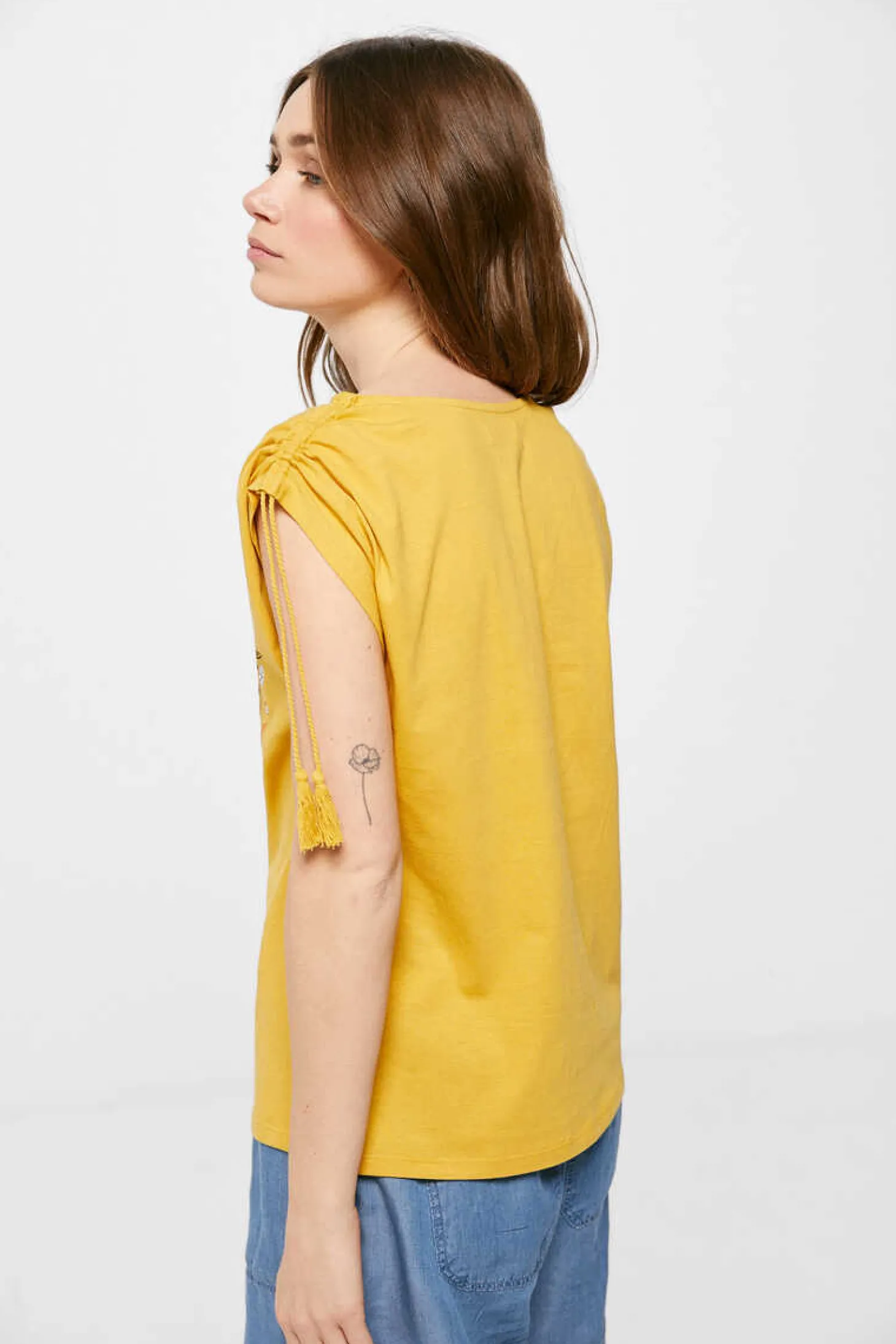 T-Shirt De Manga Curta, Com Gola Barco, Detalhe De Franzidos Com Cordao Com Borlas Nos Ombros, Com Estampado Grafico Posicional De Desenho E Texto Na Frente.
