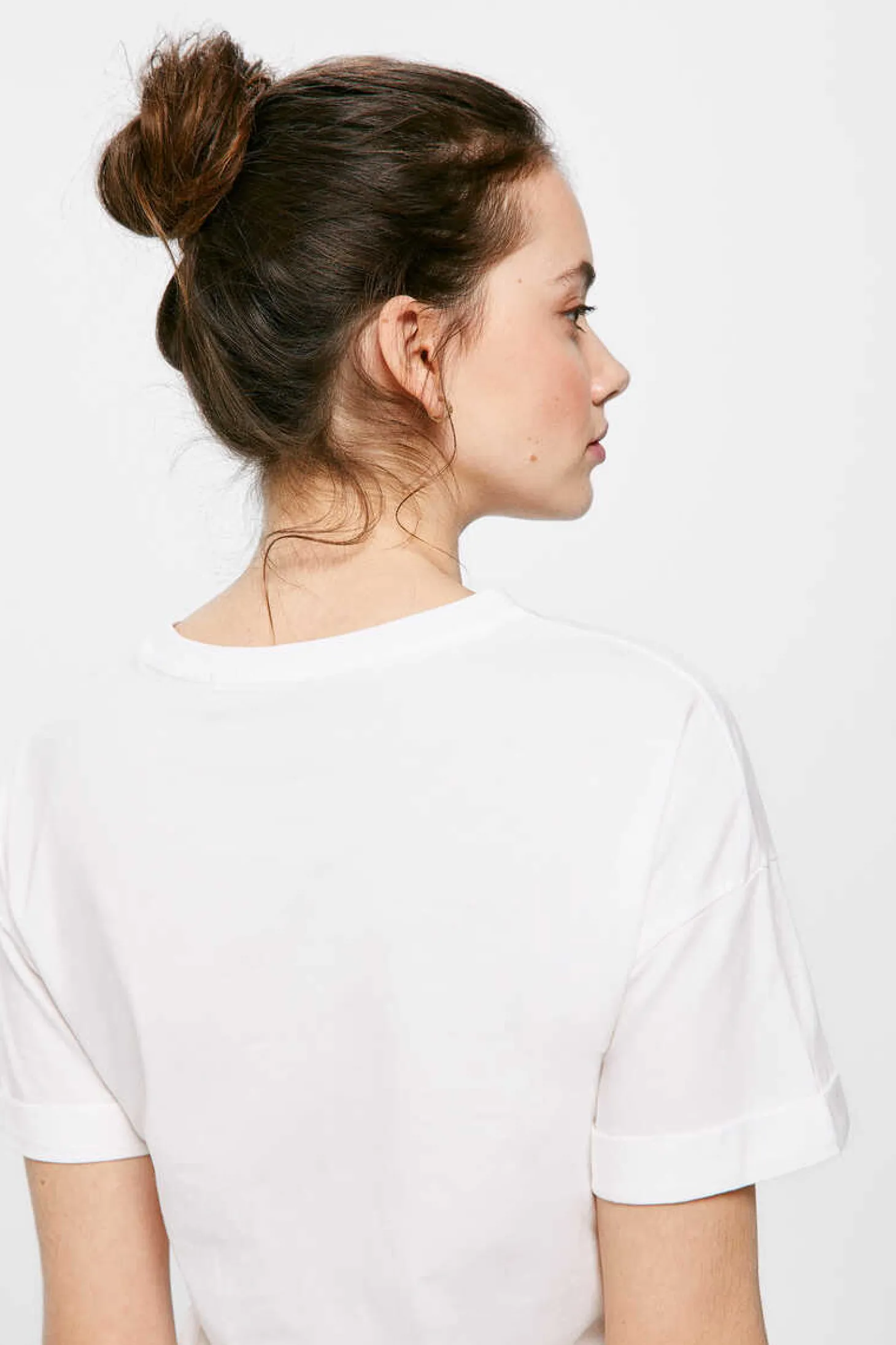 T-Shirt De Manga Caida Com Dobra, Gola Redonda, Estampagem Grafica Posicional De Desenho E Texto A Frente.