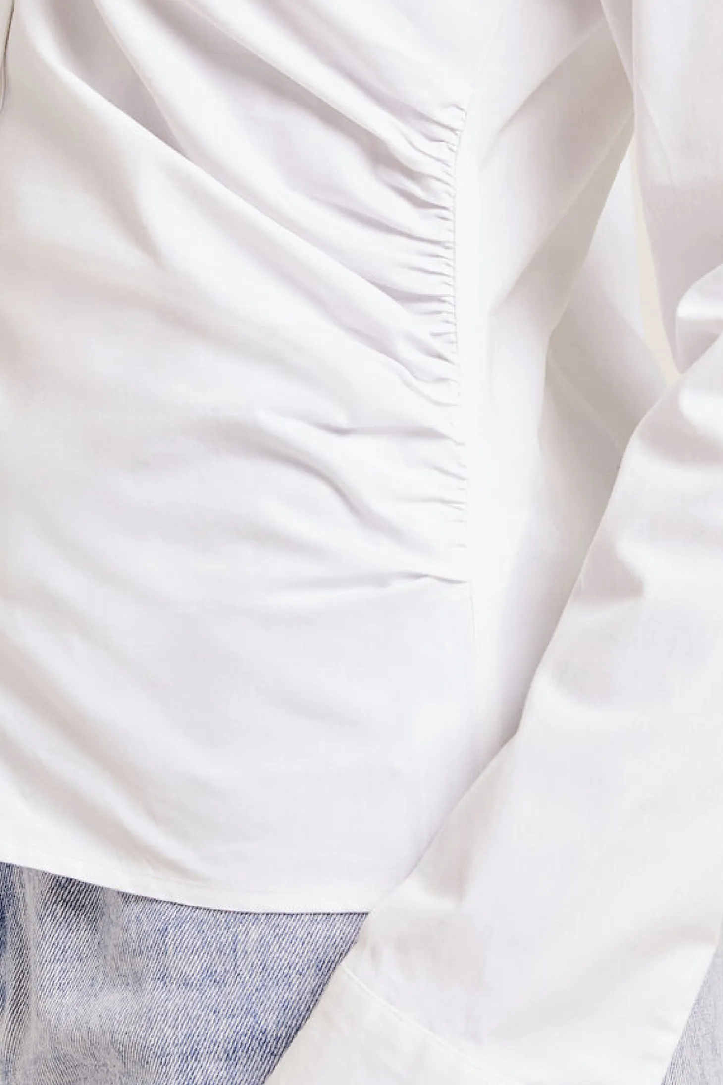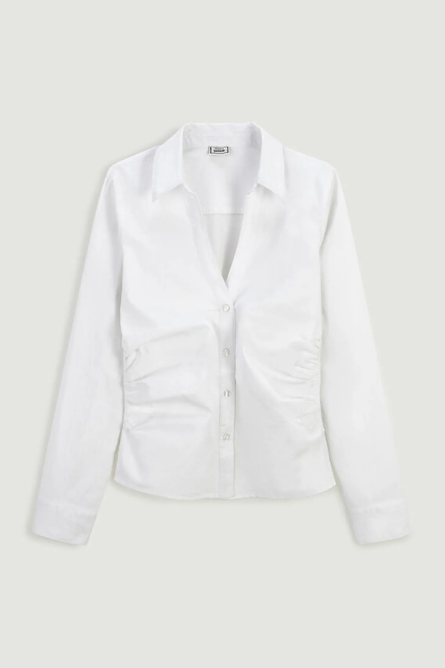 Weises Hemd Aus Leicht Dehnbarem Stoff. V-Ausschnitt. Taillierte Form Mit Raffungen An Den Seiten. Perlweise Knopfe Auf Der Vorderseite Und An Den Manschetten. … Amande Ist 1,73 M Gros Und Tragt Die Grose S.Ver Mais