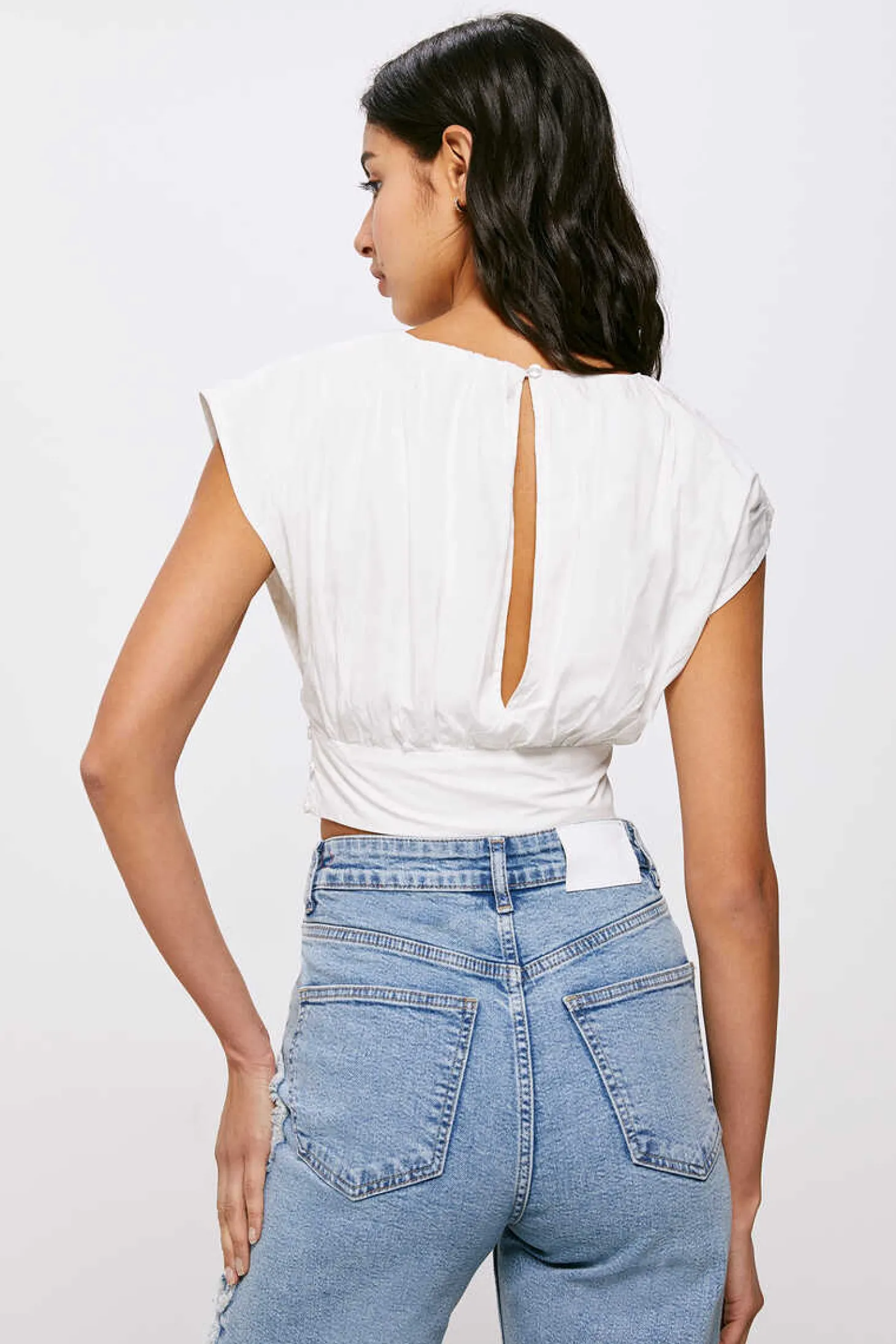 Blusa De Manga Curta, Com Gola Redonda Com Abertura Nas Costas Em Forma De Lagrima Com Botao, Com Peca Ajustada Na Cintura Com Botoes Na Lateral E Com Corpo Com … Volume.Ver Mais