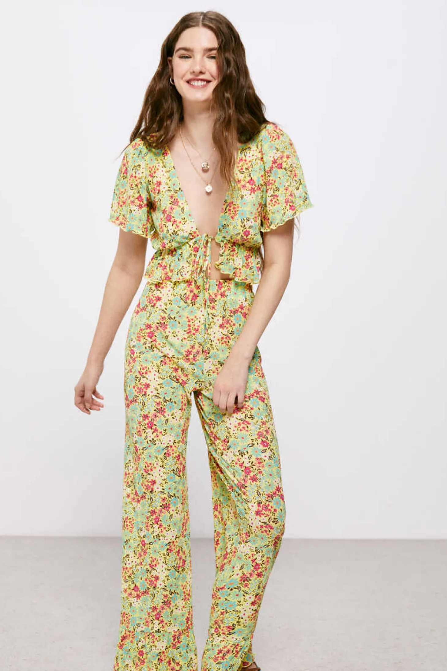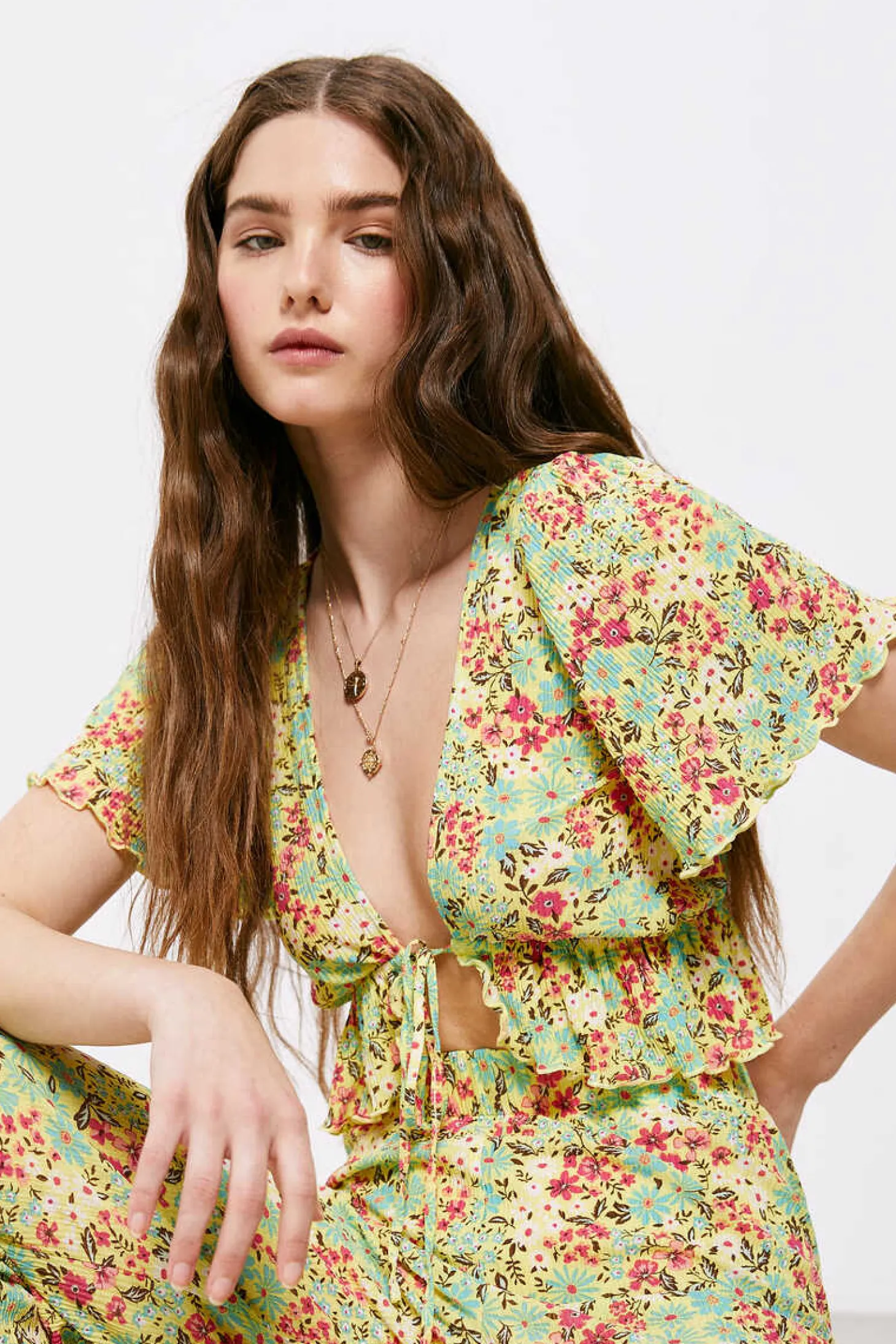 Crop Top De Manga Curta Com Roda, Com Decote Em V E Detalhe De Laco, Com Folho Na Bainha E Estampado.