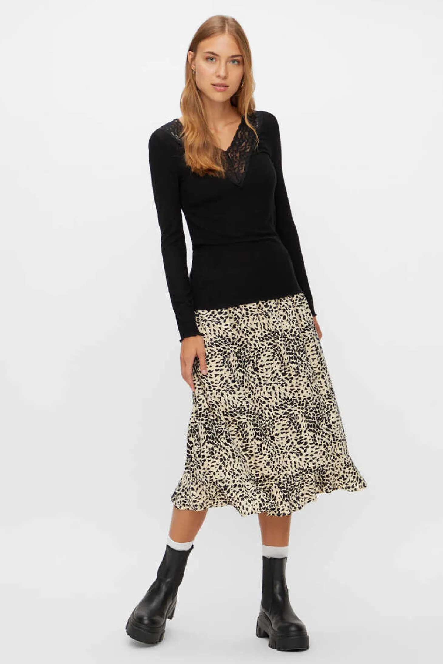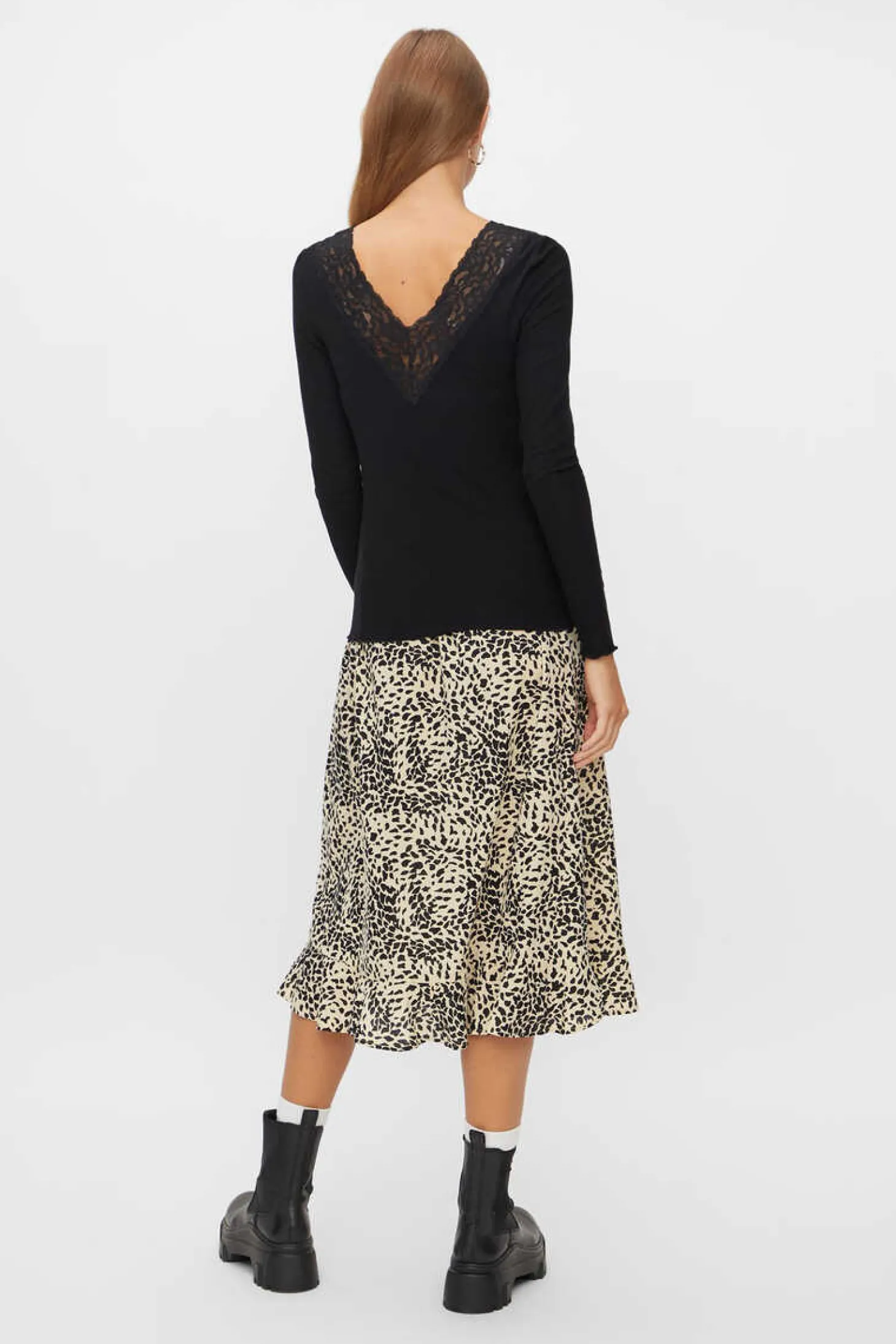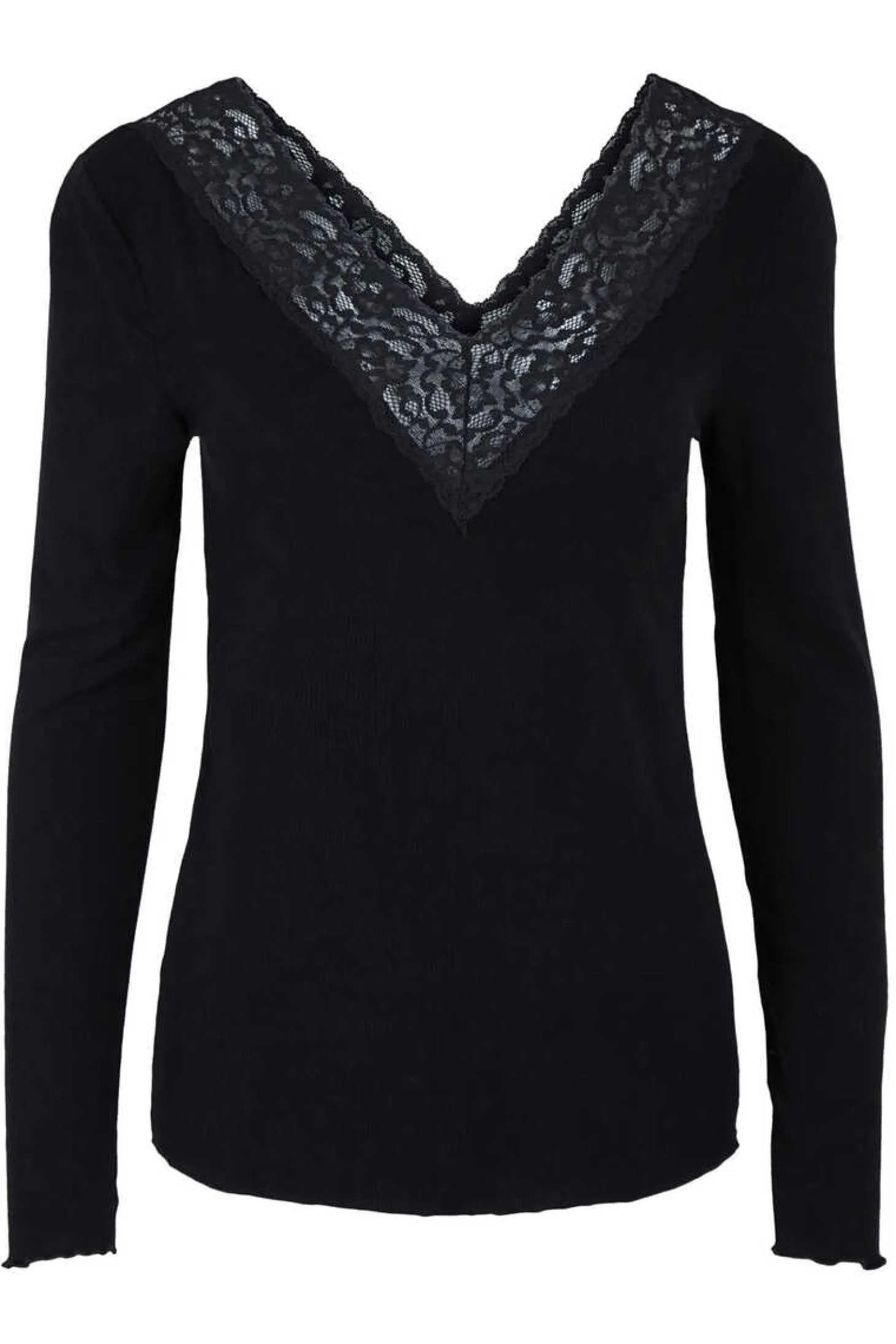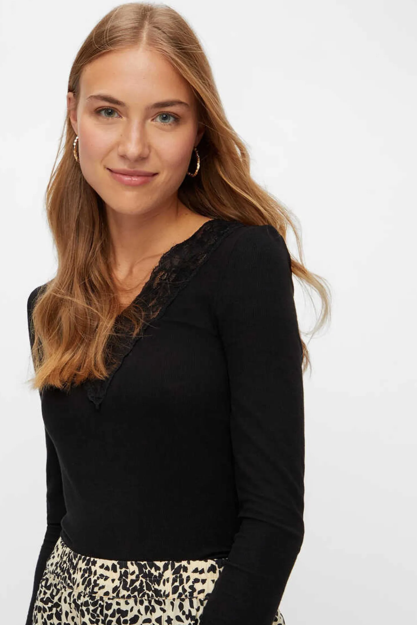 Top De Manga Comprida, Gola Em Bico Na Frente E Costas Com Detalhe De Renda. Tecido Com Estrutura Canelada.