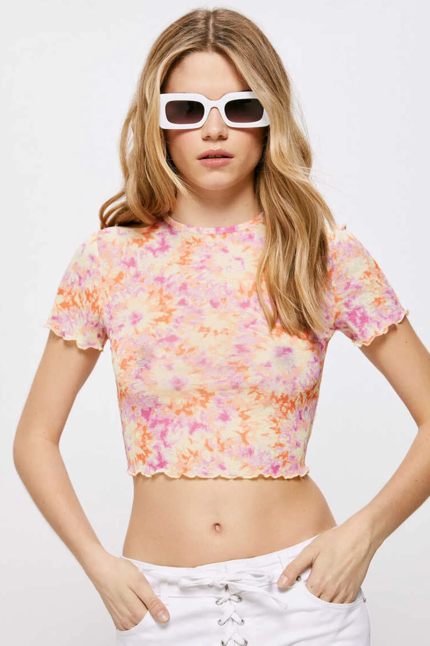 Camisola Cropped De Manga Curta, Com Gola Redonda, Com Ondulacoes Nas Mangas E Na Bainha, Com Estampado De Flores.