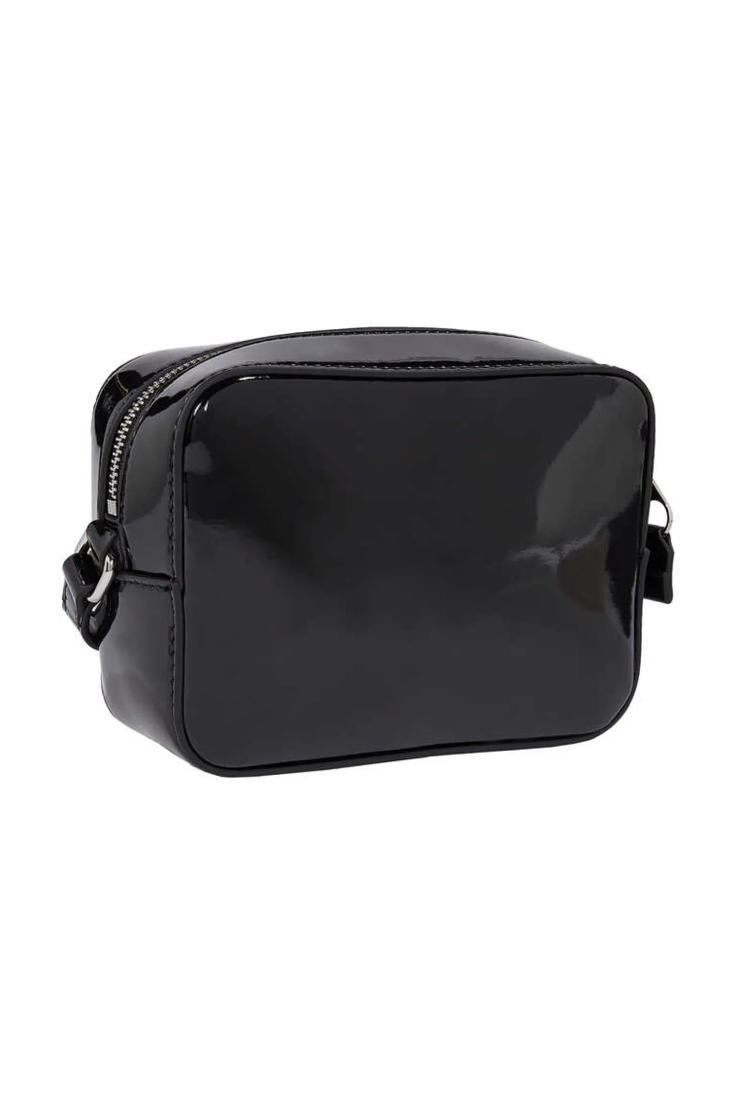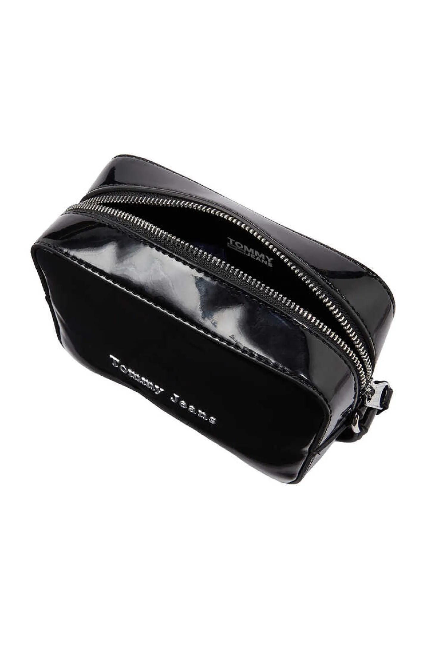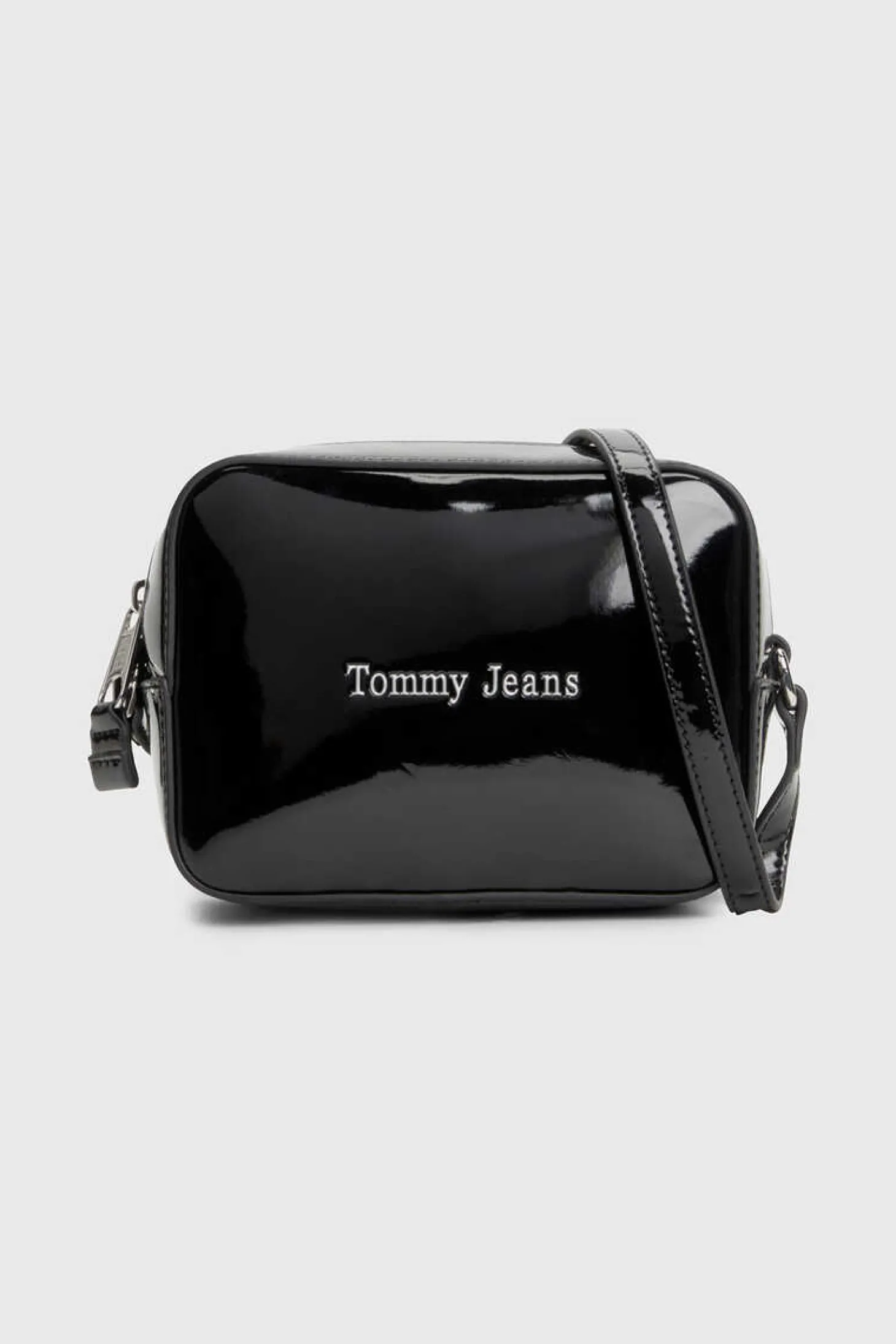 Schwarze Quadratische Umhangetasche Von Tommy Jeans Aus Okoleder Mit Lackleder-Optik. Reisverschluss. Verstellbarer Riemen.