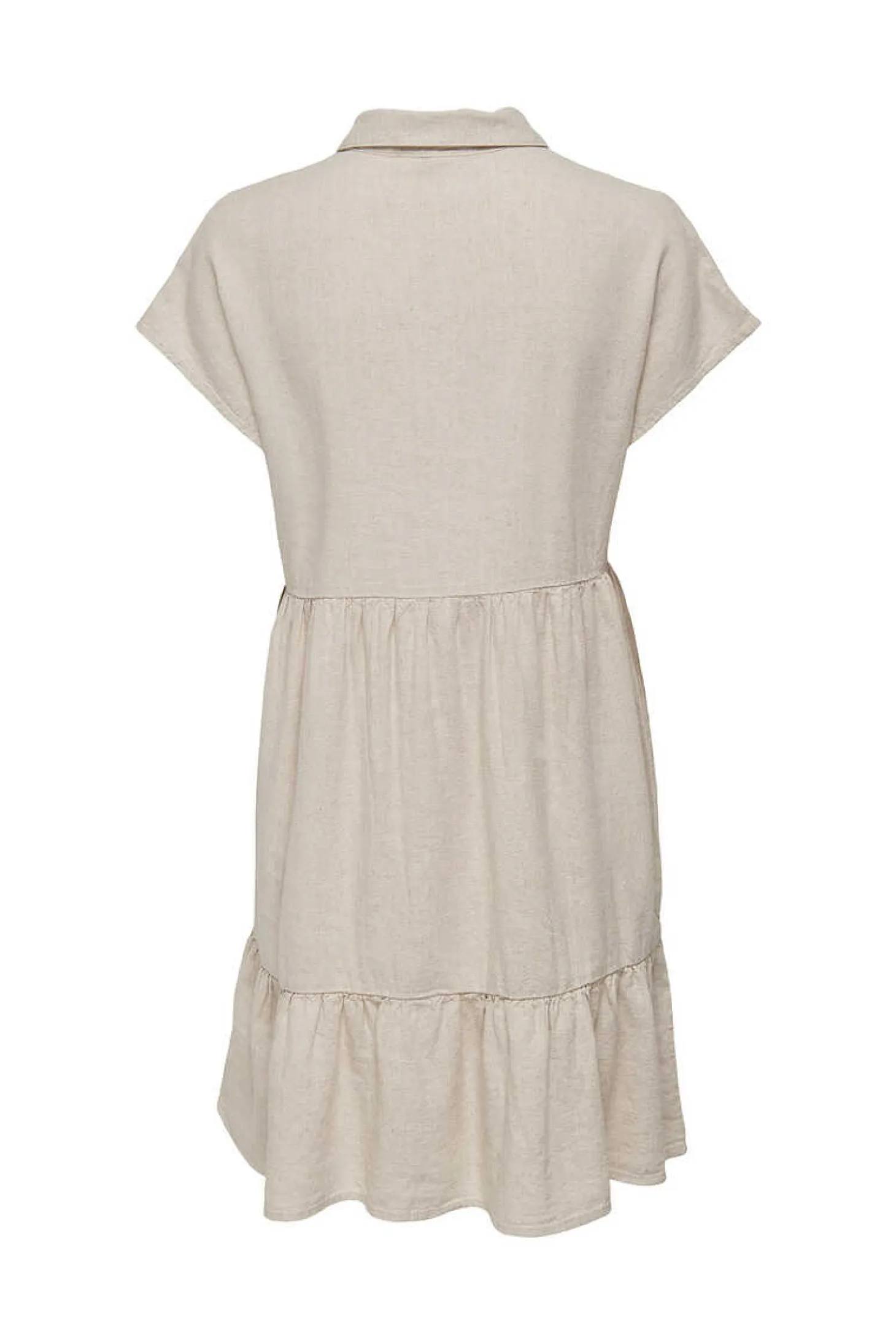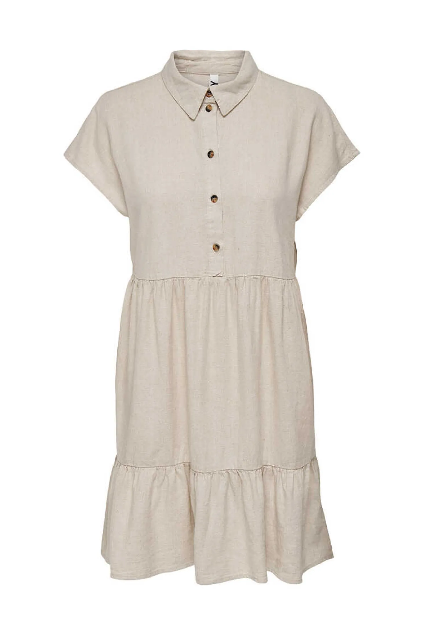 Vestido Curto Camiseiro Com Mangas Curtas. Corte Folgado De Folhos. Fecho Frontal No Peito De Botoes.