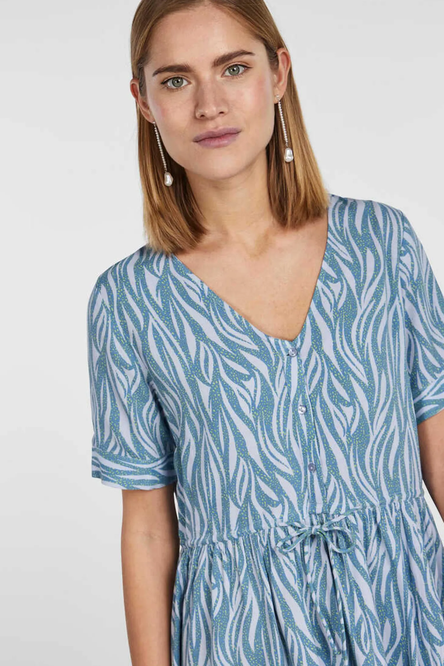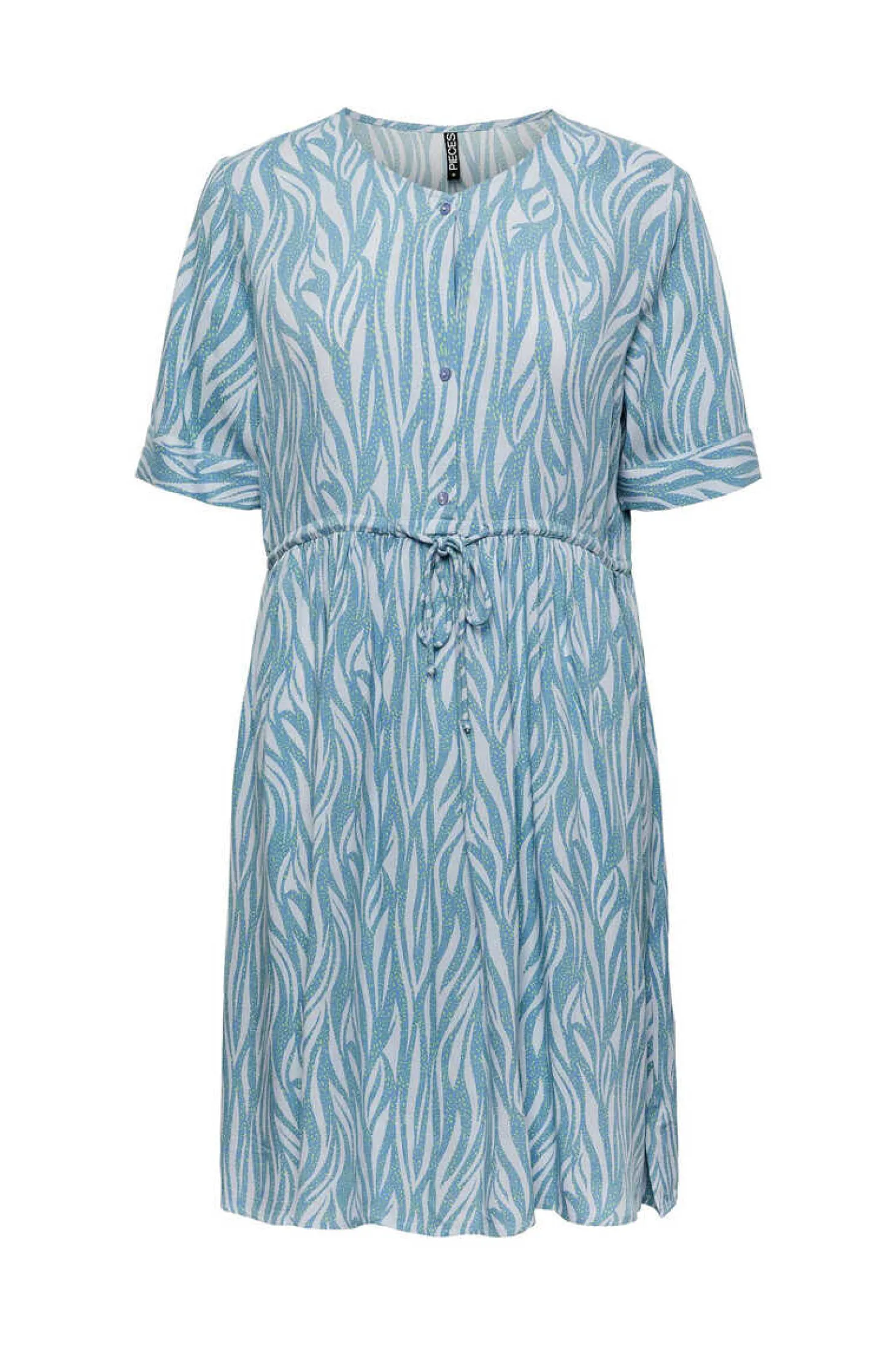 Vestido Curto Abotoado Na Parte Frontal, Detalhe De Laco Na Cintura E Manga Curta. Gola Camiseira.