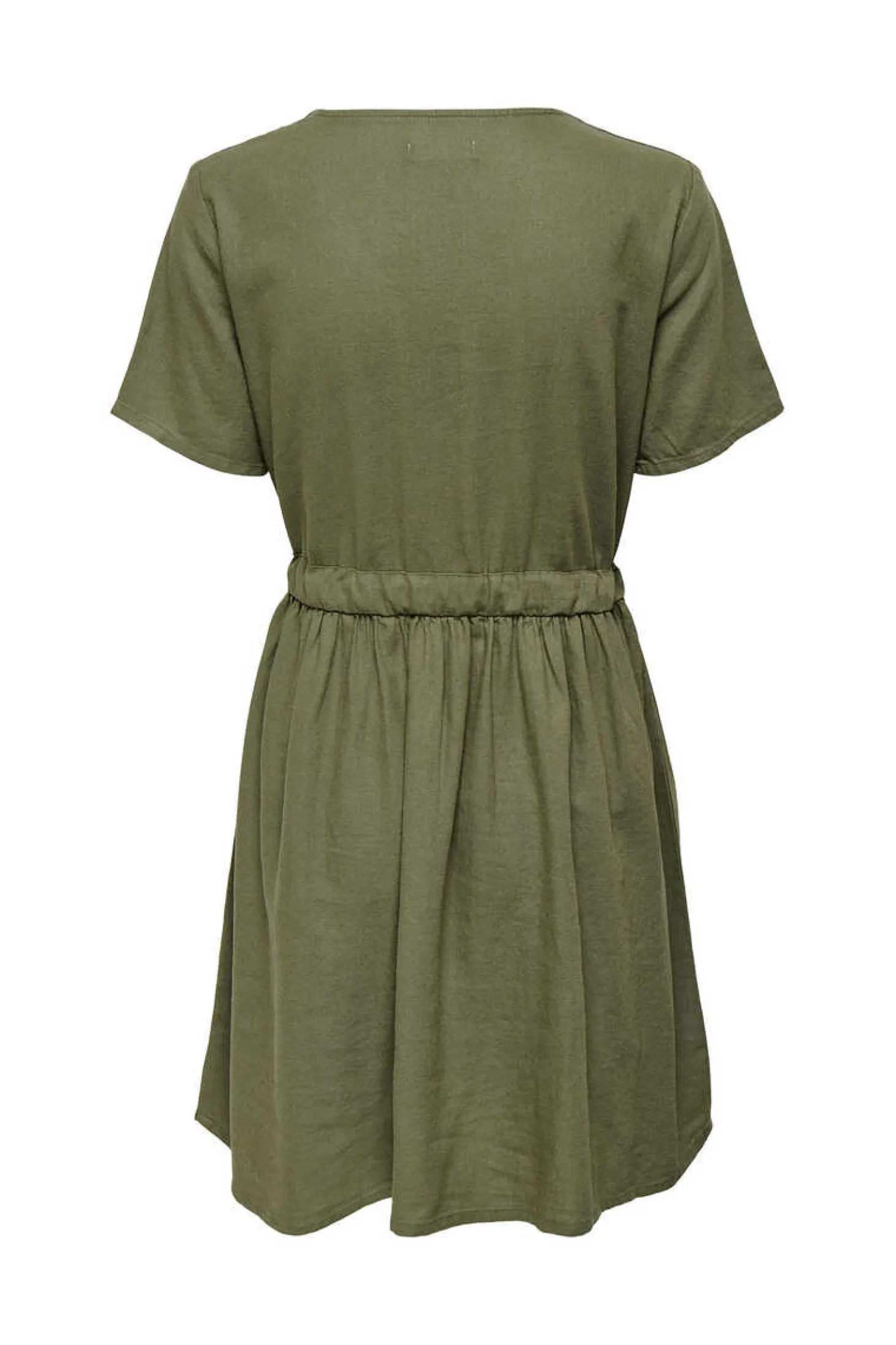 Vestido Curto De Mistura De Linho Com Decote Em Bico E Mangas Curtas. Cintura Ajustavel Com Cinto De Lacada Do Mesmo Tecido.