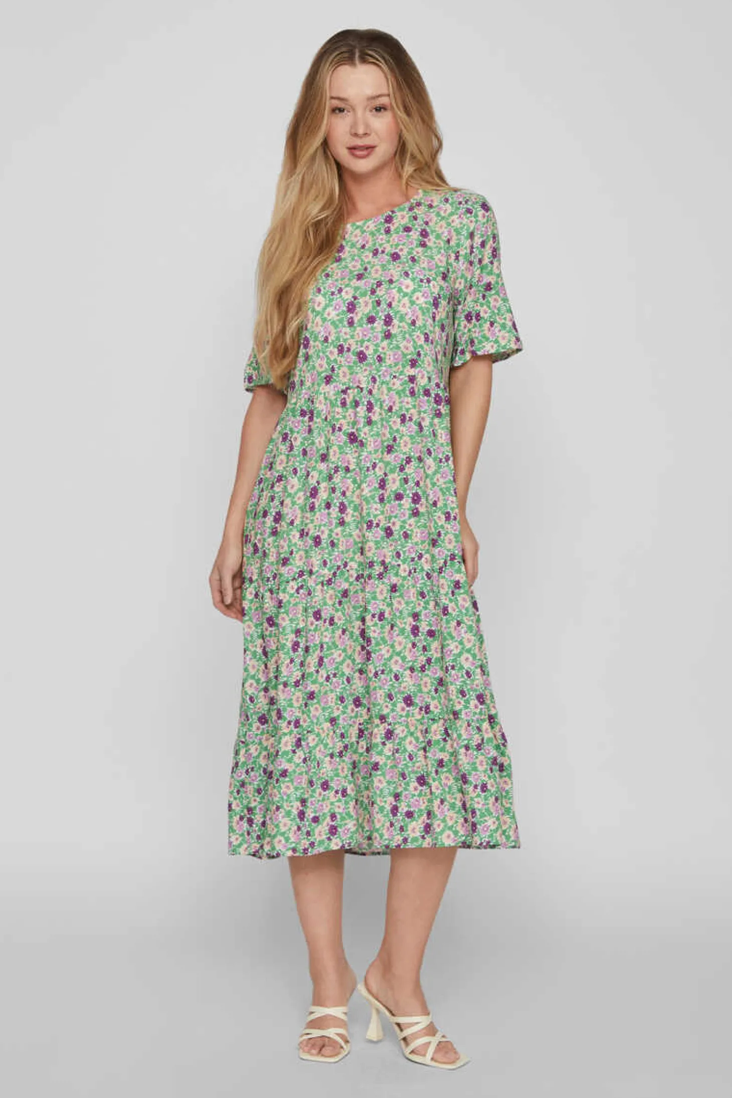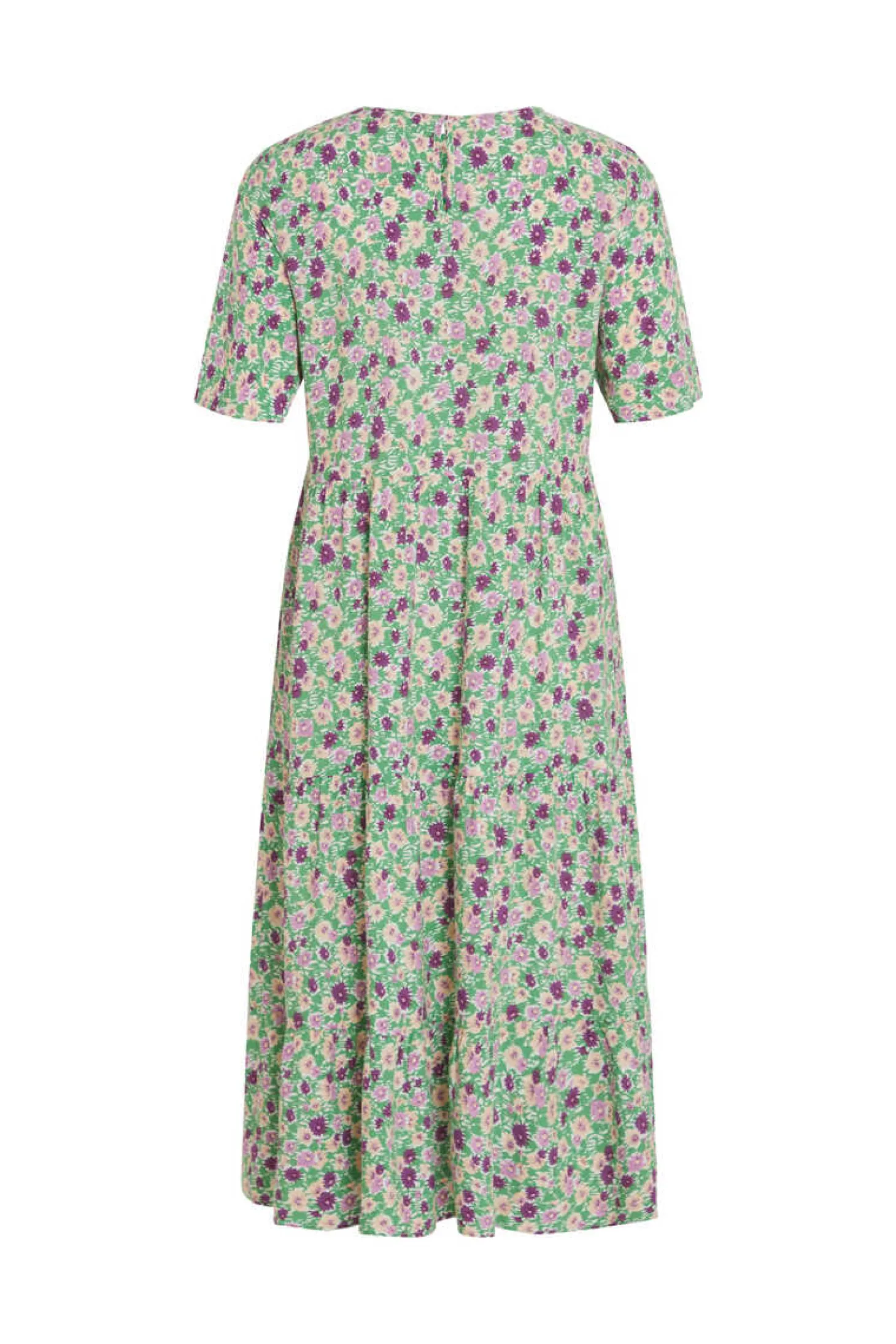 Vestido Midi De Manga Curta, Decote Redondo. Corte Folgado. Pequena Abertura Nas Costas Fechadas Mediante Botao.