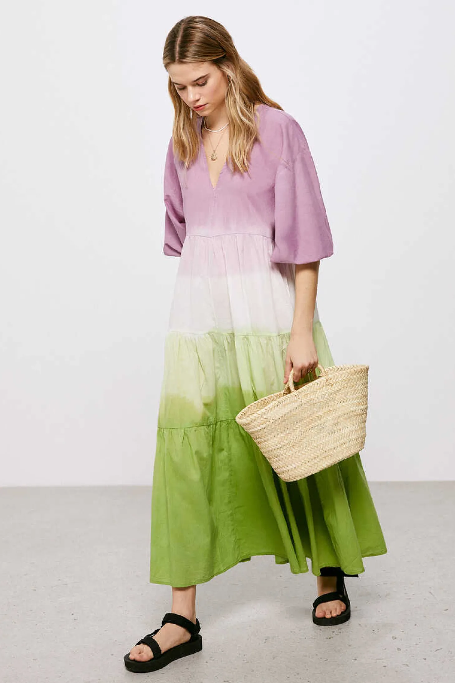 Vestido De Manga 7/8 Com Volume, Com Decote Em V, Com Elastico Nos Punhos, Com Paineis E Com Efeito Tingido.